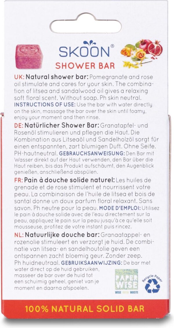 Ontspan met een zacht heerlijke bloemig geur op basis van listea en sandelhoutolie en laat je verwennen door granaatappel en rozenolie. De antioxidanten van de granaatappel en de verzorgende rozenolie voeden en hydrateren je huid en zorgen voor een stralende huid. Voor iedere huid. Zonder zeep! Vegan. Natuurlijk!