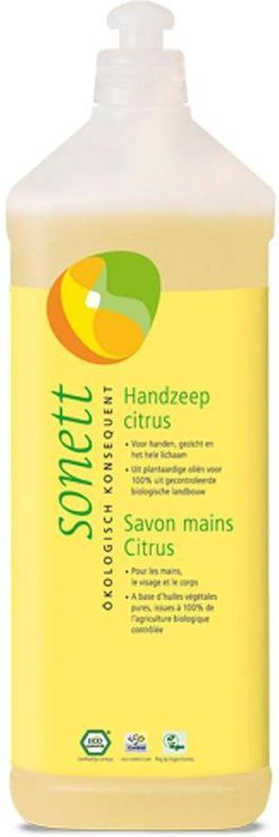 De Sonett handzeep Citrus is een vloeibare, milde en frisgeurende zeep voor de handen en het lichaam. De samenstelling is als volgt: zeep uit olijfolie, zeep uit