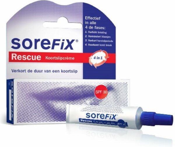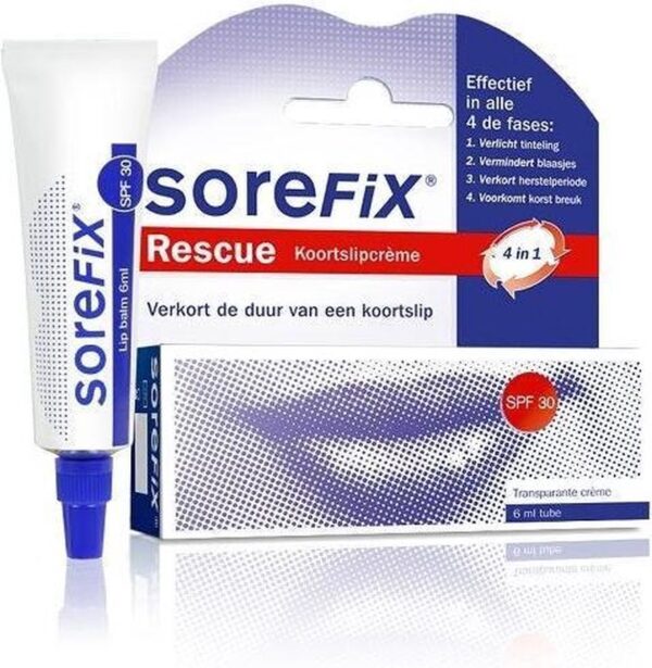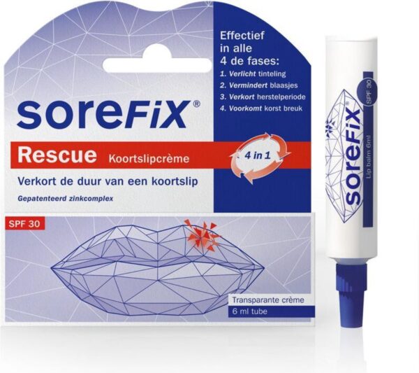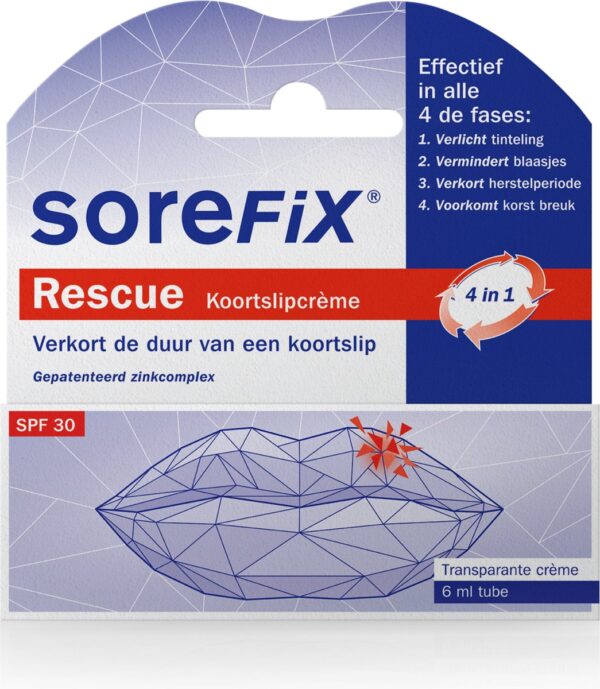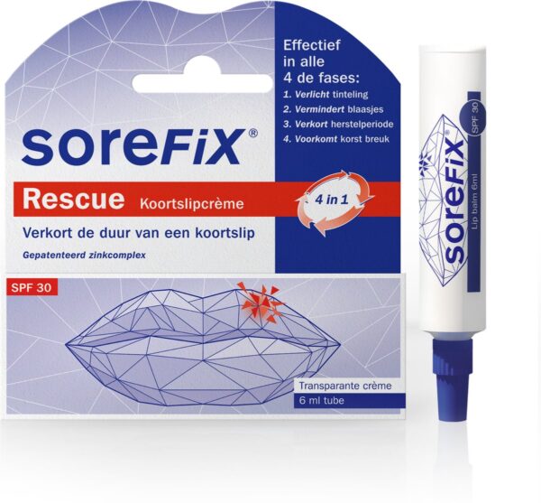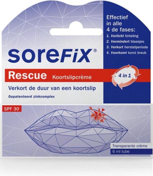 SoreFix Rescue is een op zink gebaseerde crème die de duur van een koortslip kan verkorten. Daarnaast zorgt de transparante crème ervoor dat je er minder last van hebt. SoreFix Rescue is een transparante vette crème waardoor de koortslip niet extra wordt geaccentueerd.