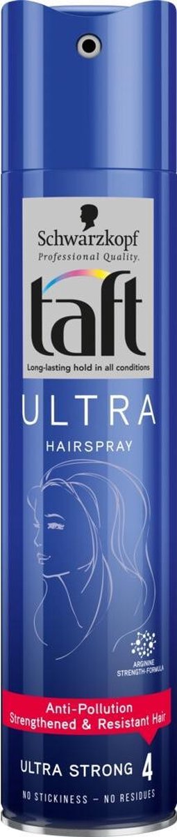 Schwarzkopf Taft Haarspray Ultra is dankzij de extra sterke fixatie bestand tegen de extreemste weersomstandigheden en blijft tot wel 24 uur goed zitten. De formule is verrijkt met het Arginine Strenght Formule die het haar versterkt en ervoor zorgt dat de haarspray niet plakt. Zo kunt u lang genieten van de perfecte afwerking van uw stijlvolle kapsel. Daarnaast zorgt de toevoeging van Arginine ervoor dat de spray gemakkelijk uit te kammen is.