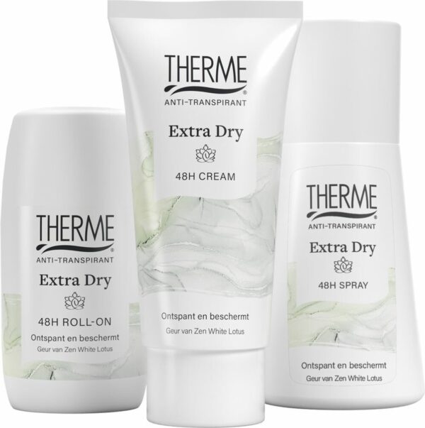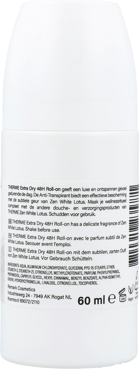 Therme Anti-Transpirant Extra Dry Zen White Lotus Roller Ontspant en geeft rust. Therme Extra Dry 48H Roll on beschermt de huid en biedt ontspanning gedurende de dag door de effectieve bescherming en subtiele geur van Zen White Lotus. Biedt 48 uur bescherming Subtiele geur van Therme Zen White Lotus 0% alcohol Herstelt de huid Vegan brand 02637287143