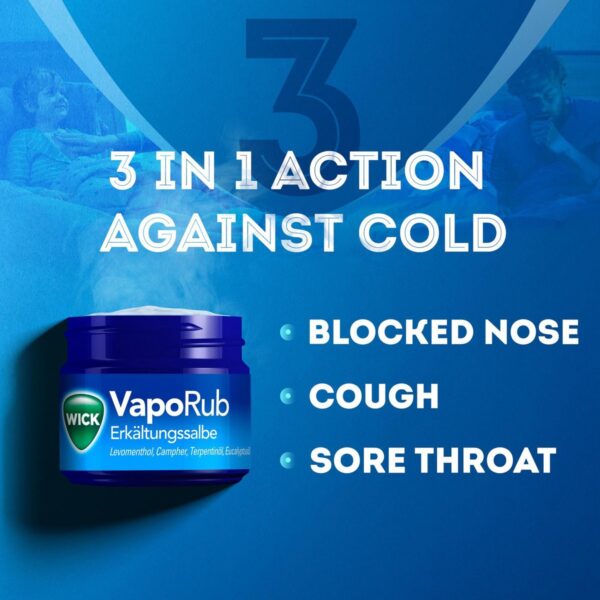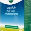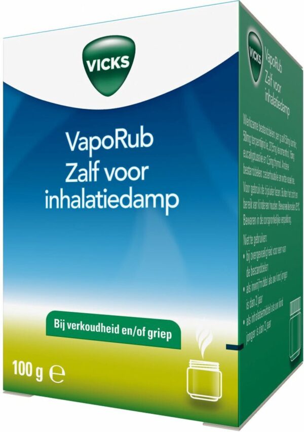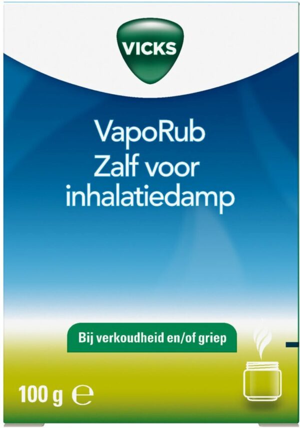 Vicks Vaporub is een inhalatiezalf die je gebruikt bij griep en verkoudheid. De zalf bestaat uit meerdere vluchtige oliën en aromatische stoffen en werkt na inhaleren via de neus. Het inhaleren van dampen die vrijkomen door lichaamswarmte of door toevoeging van de zalf aan heet water (dampbad) wordt als verlichtend ervaren.