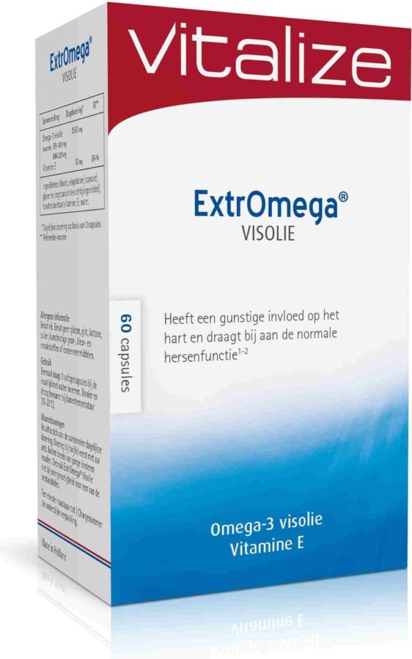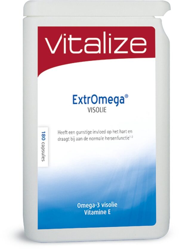 Vitalize ExtrOmega® visolie is een pure, natuurlijke koudwater visolie gecombineerd met vitamine E. De visolie is rijk aan omega-3 vetzuren met een hoge dosering EPA en DHA. De visolie is een triglyceride-olie die ten opzichte van een ethylestherolie een extra zuiveringsstap heeft ondergaan wat de opneembaarheid bevordert en oprispingen voorkomt.