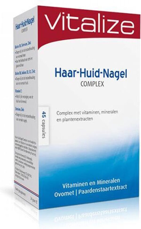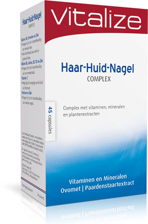 Vitalize Haar-Huid-Nagel Complex bevat daarnaast Ovomet® (eierschaalmembraan), Paardenstaartextract, Vitamines B1, B5, B6, B11, B12, Jodium, Koper, Mangaan, IJzer, Choline, Inositol, MSM, NAC en PABA.