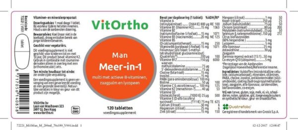 Biologisch actieve vormen van vitamine B2, B6, foliumzuur en B12. Organische mineraalverbindingen. Vitamine K2 als menachinon 7 (VitaMK-7). Natuurlijke vitamine E. Bevat 25 mcg (1000 IE) vitamine D: speelt een rol bij het behoud van sterke en soepele spieren. Draagt bij aan normale haargroei. Zorgt mede voor een goede weerstand. Bevat lycopeen, alfa-liponzuur, zaagpalm, co-enzym Q10 en astaxanthine.