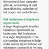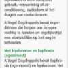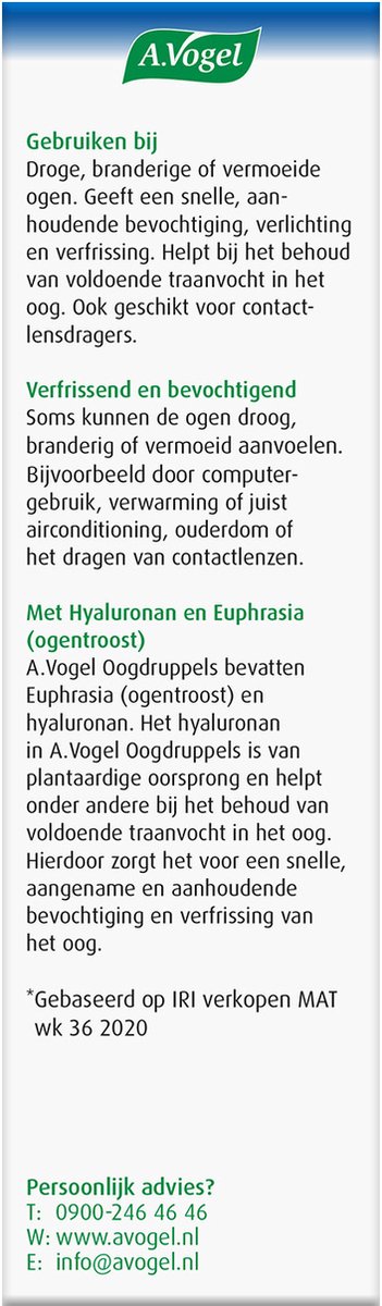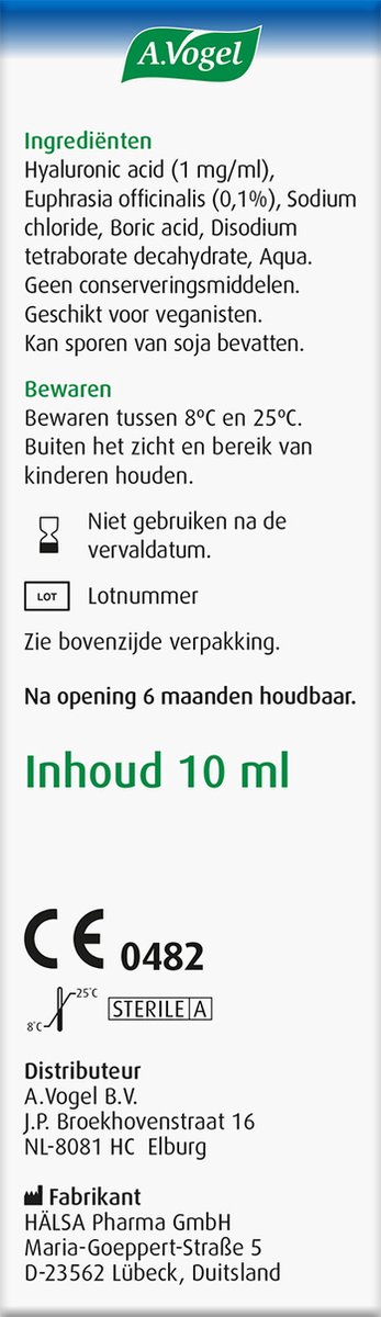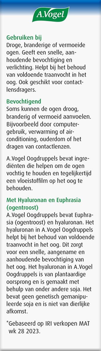 A.Vogel Oogdruppels bevatten de natuurlijke ingrediënten Euphrasia (ogentroost) en hyaluronan. Het hyaluronan in A.Vogel Oogdruppels is gemaakt met onder andere plantaardige, niet genetisch gemanipuleerde soja en niet van dierlijke afkomst. Het helpt bij het behoud van voldoende traanvocht in het oog. Hierdoor zorgt het voor een snelle, aangename en aanhoudende bevochtiging van het oog. Alle ingrediënten op een rij: