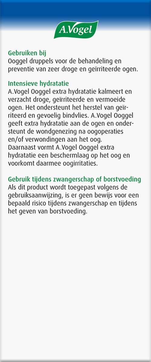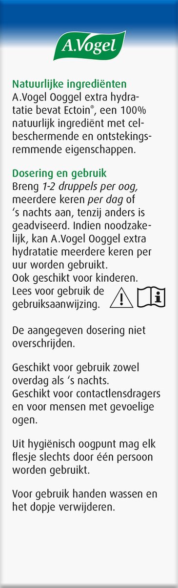 Breng 1-2 druppels per oog, meerdere keren per dag of ‘s nachts aan, tenzij anders is geadviseerd. Indien noodzakelijk, kan A.Vogel Ooggel extra hydratatie meerdere keren per uur worden gebruikt.