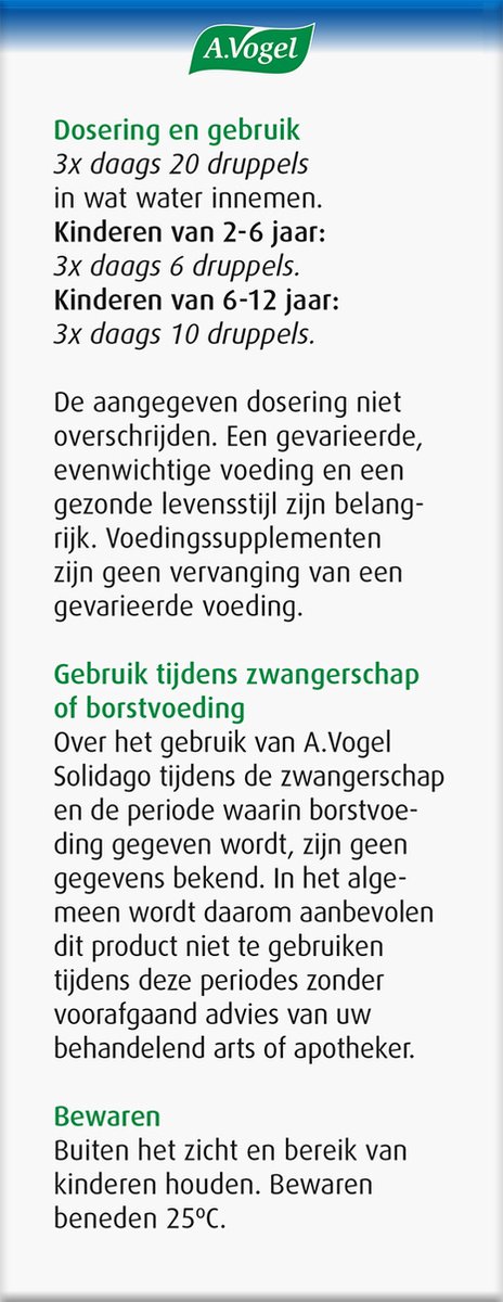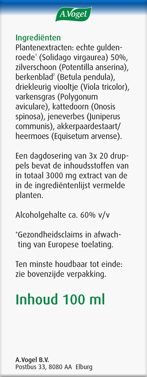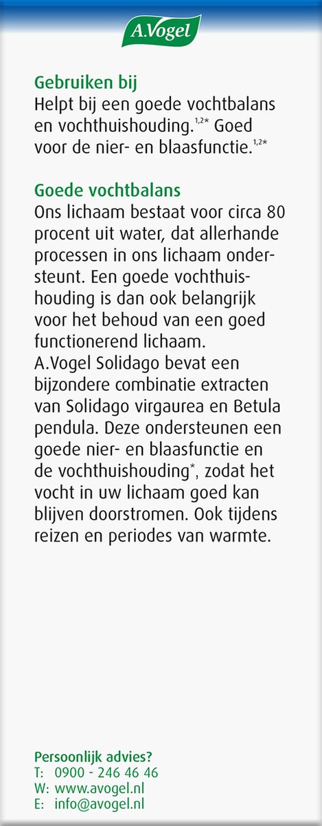 Kan je vochthuishouding soms ondersteuning gebruiken? Bijvoorbeeld tijdens reizen of in warme periodes? A.Vogel Solidago complex bevat een bijzondere combinatie van krachtige extracten van Solidago virgaurea en Betula pendula. Deze ondersteunen een goede nier- en blaasfunctie en een goede vochthuishouding*, zodat het vocht in je lichaam goed kan blijven doorstromen.