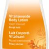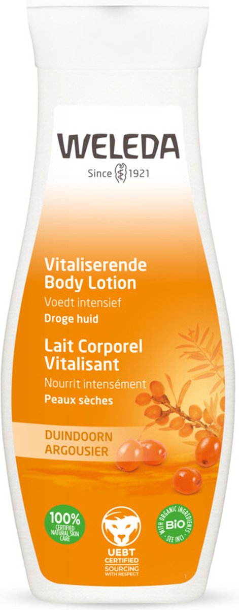 Duindoorn Vitaliserende Body Lotion voedt de droge huid intensief en hydrateert 48 uur lang. 100% biologische duindoornolie, arganolie en cacaoboter laten je huid comfortabel en gezond aanvoelen. De fruitige geur brengt je in een opgewekte stemming. brand WELEDA