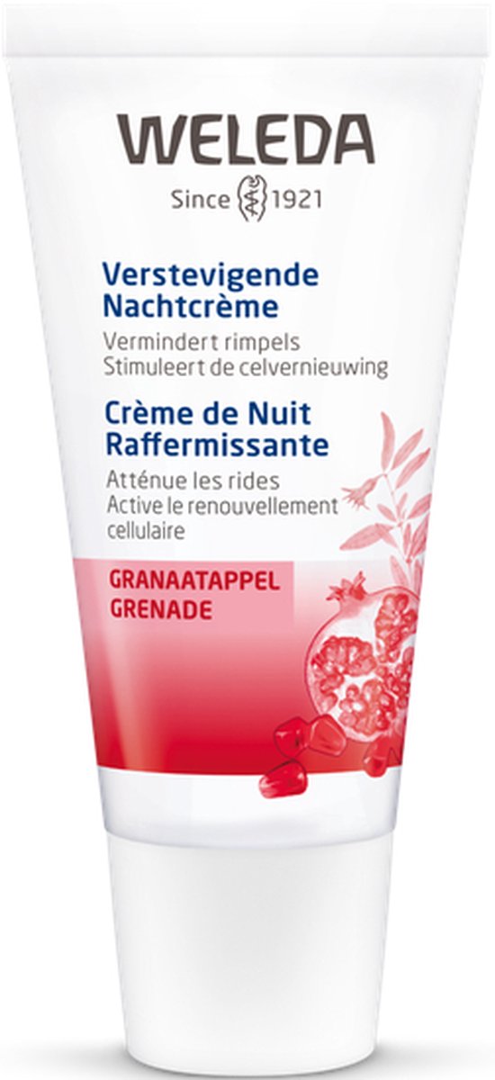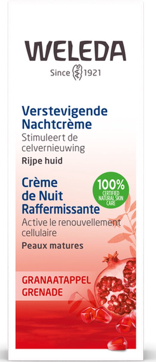 Verstevigende Nachtcrème is een rijke crème met biologische granaatappelpitolie die het nachtelijk regeneratieproces van de huid activeert. De creme stimuleert de celvernieuwing waardoor de huid versteviger wordt en rimpels verminderen. Resultaat: ‘s ochtends voelt de huid stevig aan en straalt.