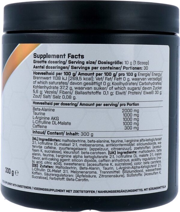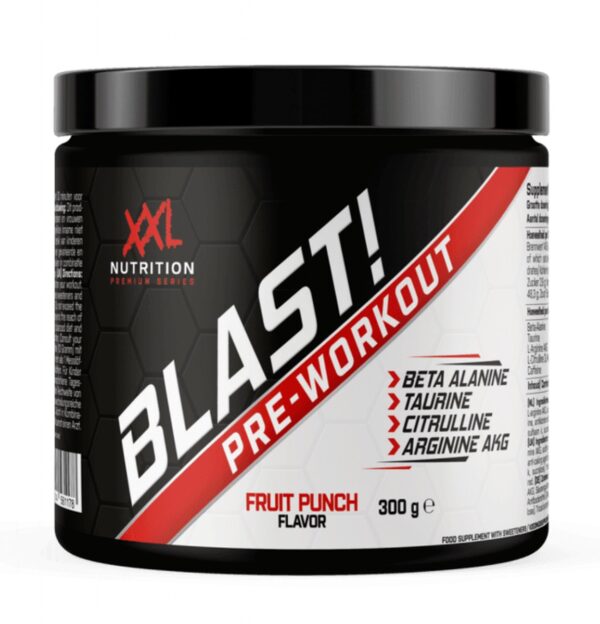 Blast! Pre Workout is een voedingssupplement met zoetstoffen en bevat een hoog cafeïnegehalte (300mg per dosering). Niet aanbevolen voor kinderen en vrouwen die zwanger zijn of borstvoeding geven.