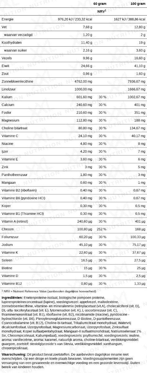 De basis van de Vegan Diet Shake wordt gevormd door erwtenproteïne-isolaat: een hoogwaardige en lactosevrije eiwitbron. Daarnaast zijn er eiwitten uit pompoenpitten toegevoegd die zijn aangevuld met voedingsvezels en een rijk profiel aan vitamines en mineralen. Één serving Vegan Diet Shake bevat maar liefst 24,6 gram eiwit, 10 gram vezels en slechts 2,2 gram suiker.