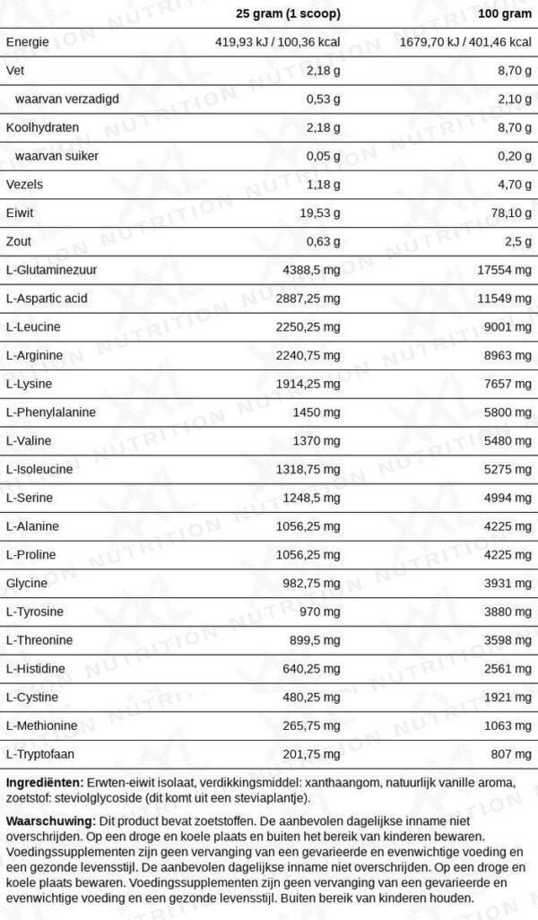 Volg jij een veganistische leefstijl en wil je er graag voor zorgen dat je eiwitinname op peil blijft? Dan is Vegan Protein van XXL Nutrition voor jou. Deze eiwitshake is naast plantaardig ook nog eens 100% natuurlijk en dankt haar hoge eiwitgehalte van 78% aan het hoogwaardige erwten-eiwit isolaat. Omdat we naast goede voedingswaarden ook een goede smaak willen garanderen hebben we hier enkel natuurlijk vanille-aroma en natuurlijke zoetstof aan toegevoegd. Eiwitten dragen bij aan de groei van spiermassa, en met Vegan Protein doe je dit ook nog eens op superlekkere wijze!