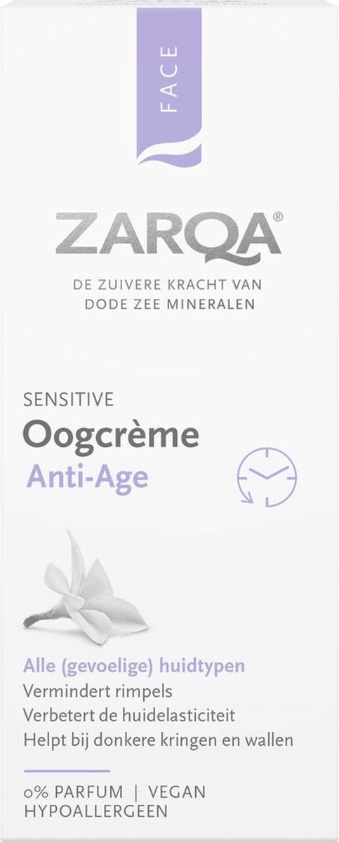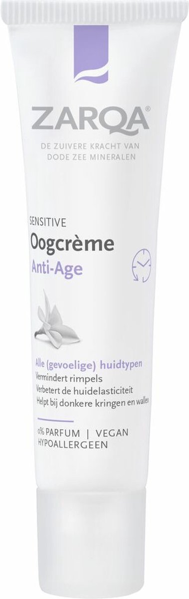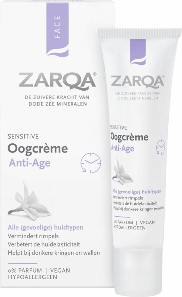 ZARQA Oogcrème Anti-Age met Dode Zee mineralen verzacht rimpels en verstevigt de gevoelige huid rond de ogen intensief. De crème helpt bij donkere kringen en wallen. Vermindert fijne lijntjes en tekenen van vermoeidheid. Dankzij de milde samenstelling ook geschikt voor lensdragers.
